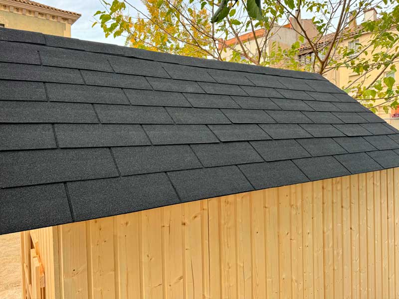 La teja asfáltica es la solución más práctica y atractiva para impermeabilizar cubiertas ligeras de madera. Fabricada con betún modificado y armadura de fibra de vidrio, ofrece gran estanqueidad, resistencia a los rayos UV y a los cambios de temperatura, con un acabado tipo teja/pizarra disponible en varios colores. Es perfecta para casetas, bungalows, porches, pérgolas y garajes.